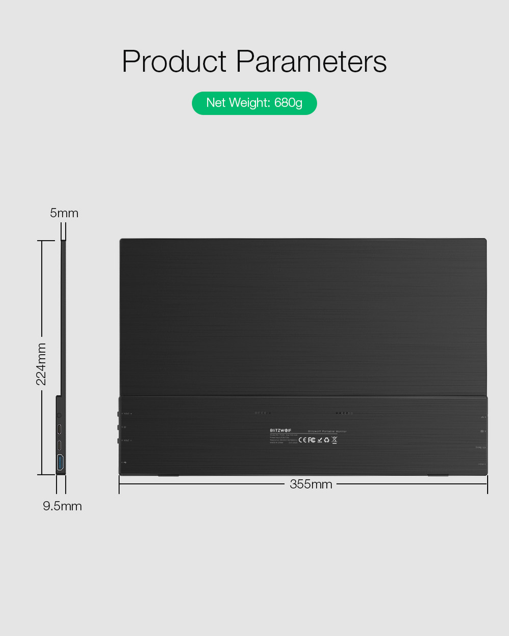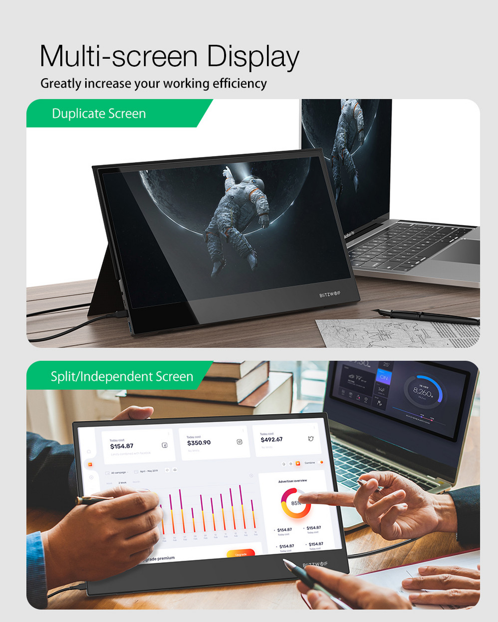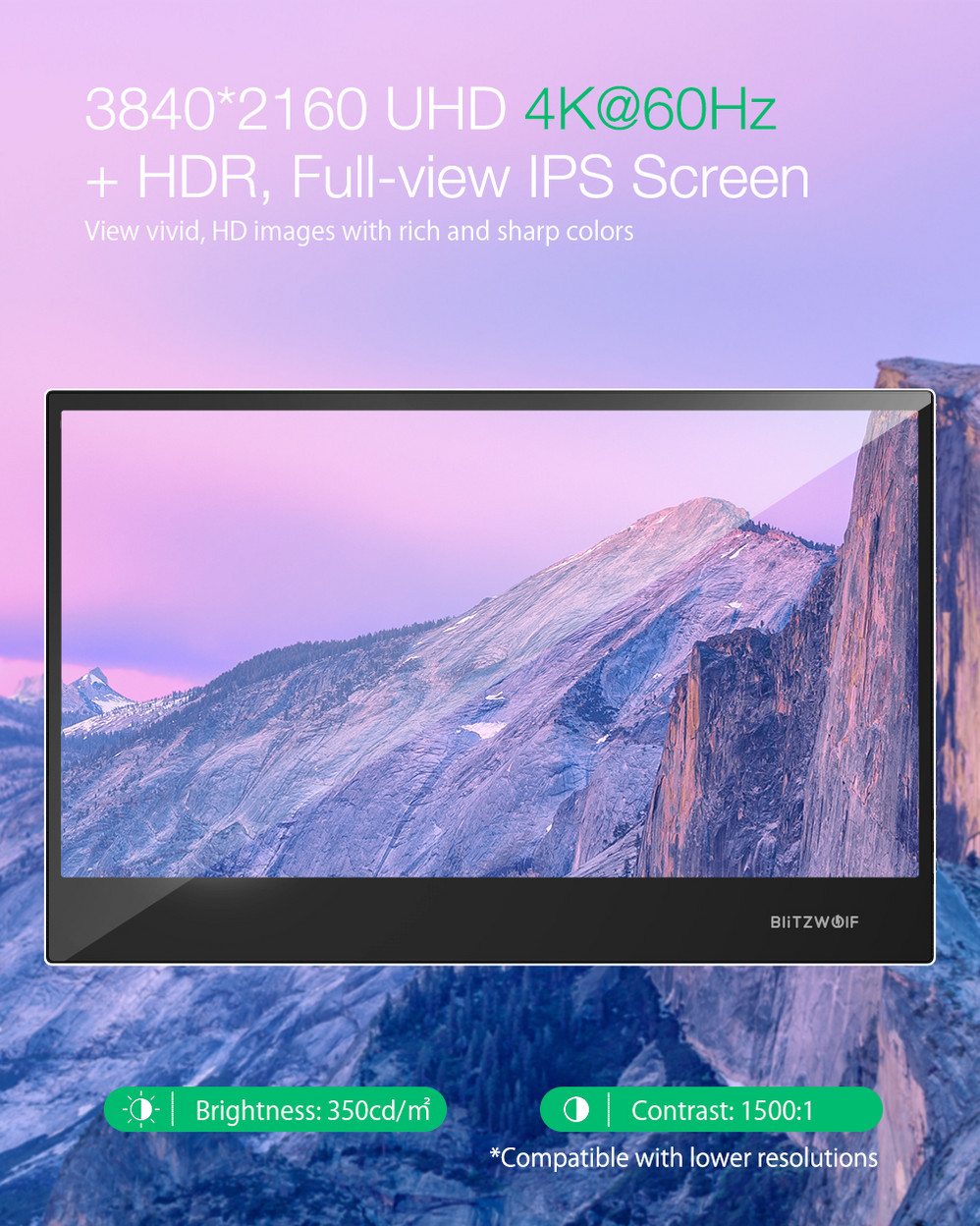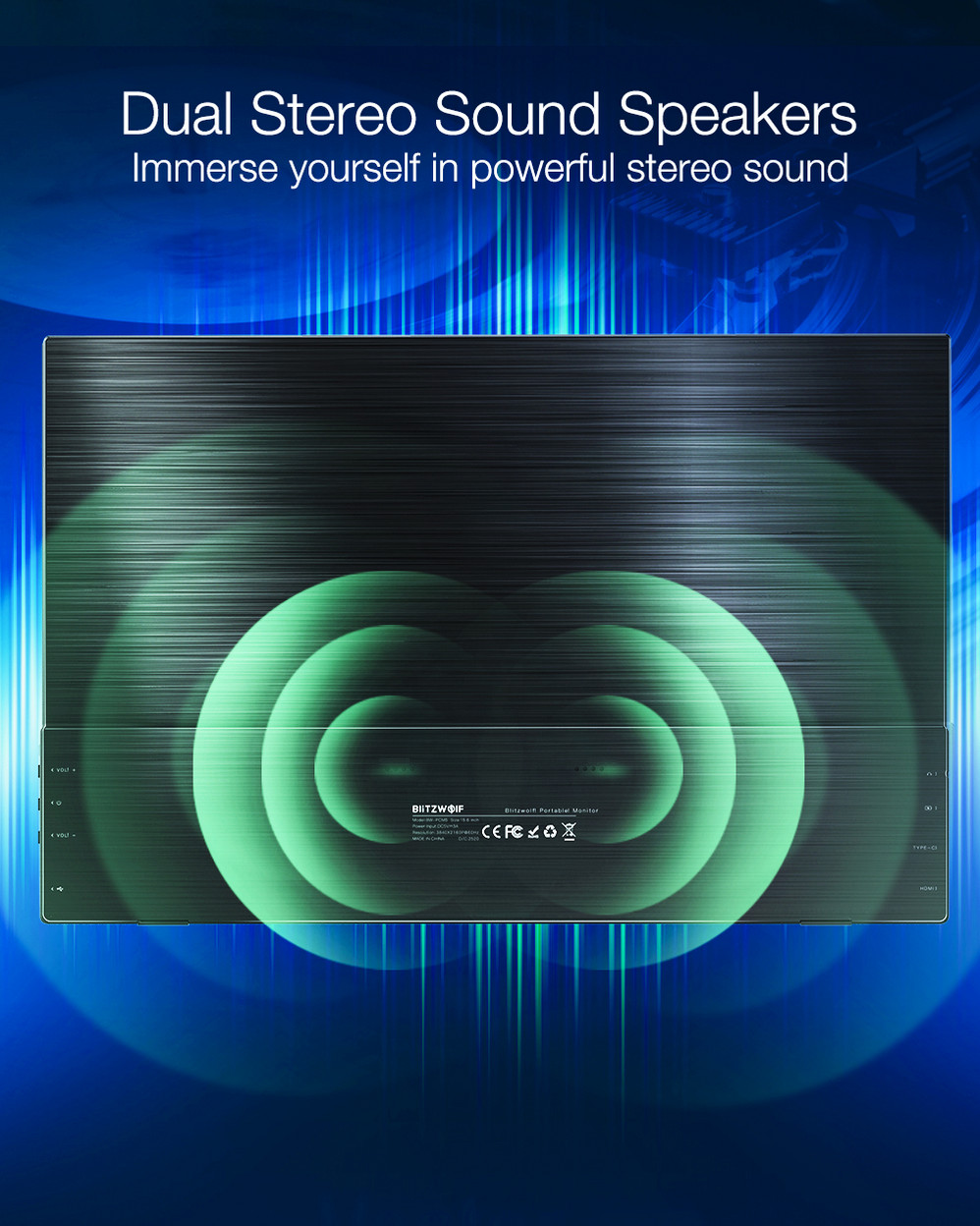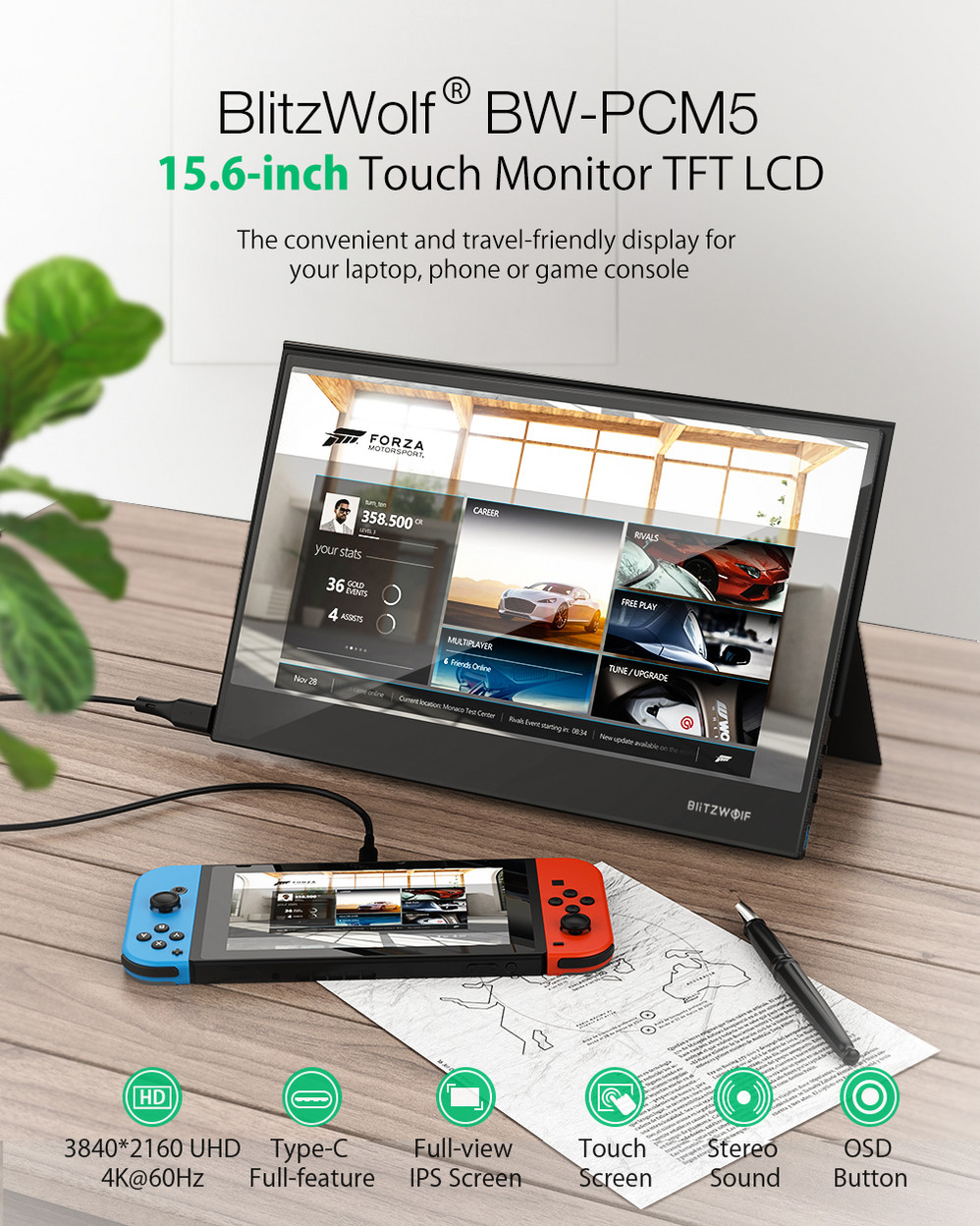 BlitzWolf® 15.6" Touch Monitor TFT LCD with 3840*2160 UHD, 4K@60Hz, Touch Screen, Full-view IPS Screen, Stereo Sound, Type-C Full-feature and OSD Button